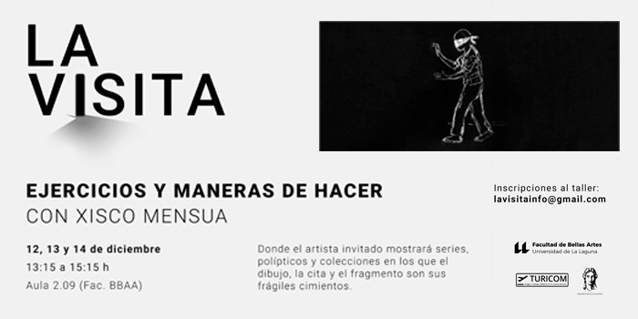 El Área de Estética de la Facultad de Bellas Artes de la Universidad de La Laguna, Ateneo de la Laguna y Grupo TURICOM organizan ‘La Visita. Ejercicios y maneras de hacer con Xisco Mensua’, donde el artista invitado mostrará series, polipticos y colecciones en los que el dibujo, la cita y el fragmento son sus frágiles cimientos.