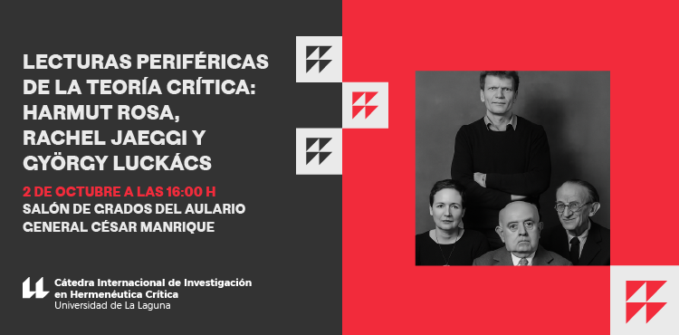 Seminario internacional en el que se pretende presentar y promover el estudio de autores/as marginales, aunque centrales para pensar el presente, en la Teoría Critica. El jueves 2 de octubre los autores a tratar serán Harmut Rosa y Rachel Jaeggi por la profesora Nantu Arroyo (UAM) y György Lukács por la profesora Lorena Acosta (ULL).