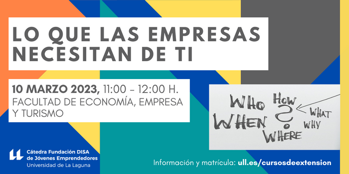Actividad de Extensión Universitaria organizada por la Cátedra Fundación DISA de Jóvenes Emprendedores de la Universidad de La Laguna, dentro del Proyecto de la ULL: Acciones y Formación en Innovación y Emprendimiento para la Educación Superior (IDEATION), que se celebrará en la Facultad de Economía, Empresa y Turismo el 10 de marzo de 2023 de 11:00 a 12:00 horas.