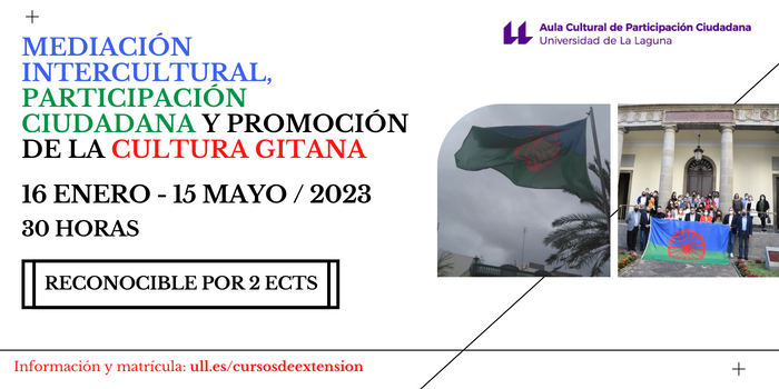 Curso de Extensión Universitaria organizado por el Aula de Participación Ciudadana de La Universidad de La Laguna con la colaboración de la Federación Socio Cultura E Rroma Va, que se desarrollará entre el 16 de enero y 15 de mayo de 2023, reconocible por 2 créditos ECTS.