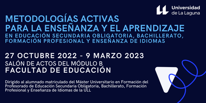 Actividad de Extensión Universitaria organizada por la Dirección del Máster Universitario en Formación del Profesorado de Educación Secundaria Obligatoria, Bachillerato, Formación Profesional y Enseñanza de Idiomas de la Universidad de La Laguna, con la colaboración de la Facultad de Educación, que se celebrará en la Facultad de Educación entre el 27 de octubre de 2022 y el 9 de marzo de 2023.