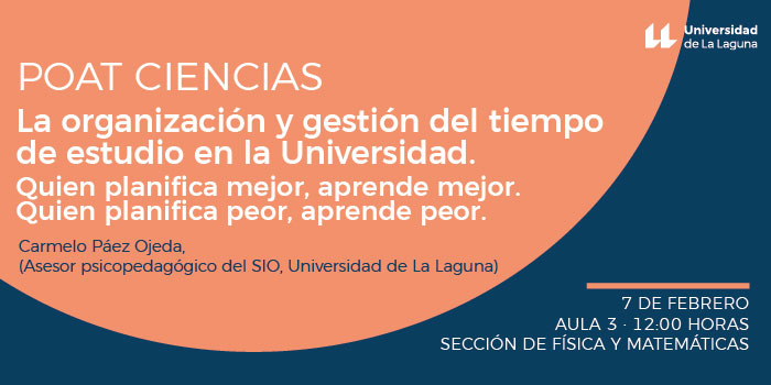 Actividad del POAT de la Facultad de Ciencias titulada: «La organización y gestión del tiempo de estudio en la Universidad. Quien planifica mejor, aprende mejor. Quien planifica peor, aprende peor» impartida por Carmelo Páez Ojeda, asesor psicopedagógico del SIO de la Universidad de La Laguna.