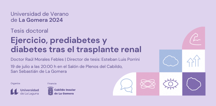 Este año contaremos con la presentación de resultados de la tesis doctoral «Ejercicio, prediabetes y diabetes tras el trasplante renal» en el marco de la “Universidad de Verano de La Gomera 2024”, que tendrá lugar el próximo 19 de julio en el Salón de Plenos del Cabildo Insular de La Gomera a las 20:00 horas.