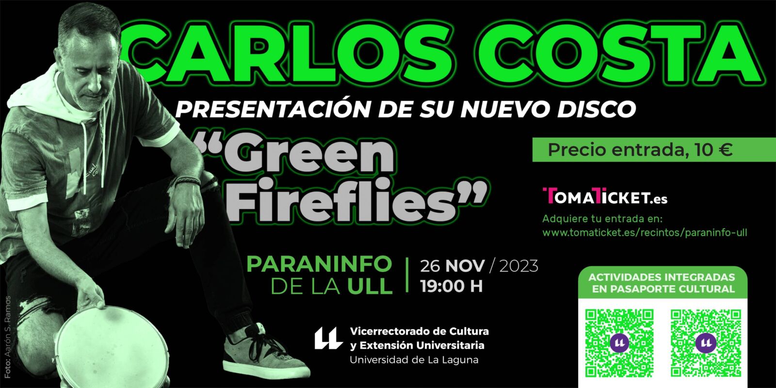 “Green Fireflies” es el nuevo proyecto discográfico del artista, contrabajista y panderista, Carlos Costa. La música grabada en Brooklyn Nueva York en octubre de 2022 tiene como fuente el trabajo científico de la astrofísica Rebeca Galera que desarrolló su investigación en torno a las Nebulosas Planetarias a las que llamaba “Mis luciérnagas verdes” de ahí el título del disco. Cuenta con la presencia de músicos tan destacados como Tomas Fujiwara (batería) y Patricia Brennan (vibráfono) músicos destacados de la escena neoyorquina. Manolo Rodríguez (electrónica y productor artístico), Yossi Itskovich (trombón), Luisa Machado (Voz) o Ibrahima Sarr (Rap). El disco posee un fuerte componente rítmico-melódico que será presentado en este espectáculo.