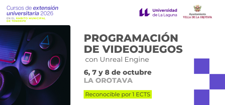 La Orotava acoge el curso «Programación de videojuegos con Unreal Engine», organizado conjuntamente por el Vicerrectorado de Cultura y Extensión Universitaria y el Ayuntamiento de la Villa de La Orotava, dentro de la programación de los Cursos de Extensión Universitaria en el ámbito municipal “Ayuntamientos 2026”, que se celebrará los días 6, 7 y 8 de octubre de 2026.