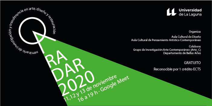 Actividad de Extensión Universitaria organizada por Aula Cultural de Diseño y el Aula Cultural de Pensamiento Artístico Contemporáneo, con la colaboración del Grupo de Investigación Arte Contemporáneo (Arte_C) y el Departamento de Bellas Artes de la ULL, que tendrá lugar del 11 al 13 de noviembre de 2020, en modalidad online.
