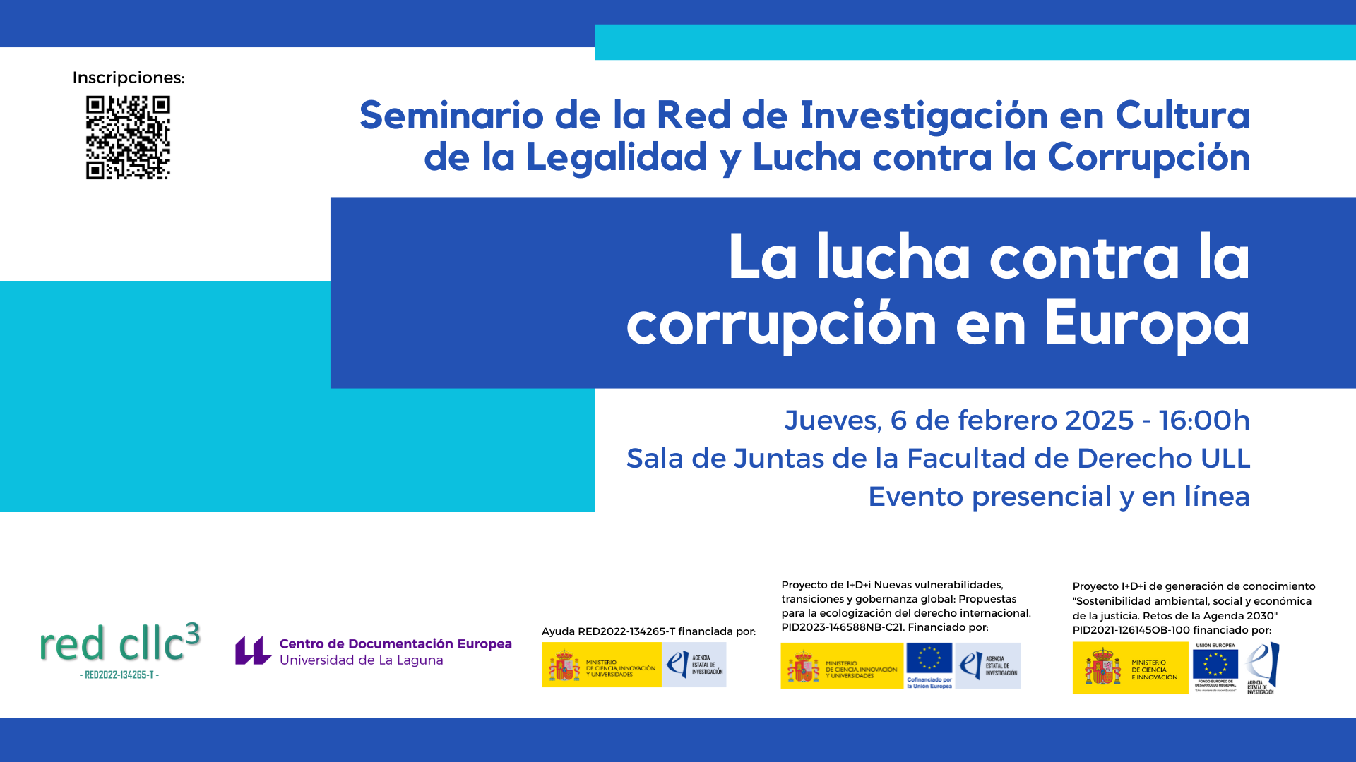 El Centro de Documentación Europea de la Universidad de la Laguna organiza este jueves, 6 de febrero, en la Sala de Juntas de la Facultad de Derecho de la Universidad de La Laguna un seminario de investigación de la Red de Investigación en Cultura de la Legalidad y Lucha contra la Corrupción «La lucha contra la corrupción en Europa»