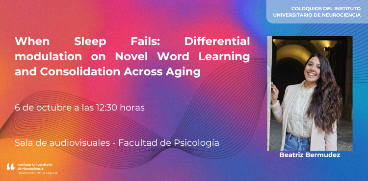 El Instituto Universitario de Neurociencia (IUNE) organiza la conferencia de la Dra. Beatriz Bermúdez, de la Universidad de Salamanca, titulada ‘When Sleep Fails: Differential modulation on Novel Word Learning and Consolidation Across Aging’. Este evento tendrá lugar el próximo lunes 6 de octubre a las 12:30h en la sala de audiovisuales de la Facultad de Psicología y Logopedia (Universidad de La Laguna).