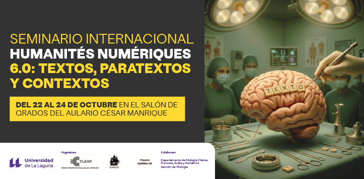 Del 22 al 24 de octubre, en la Salón de Grados del Aulario César Manrique, Campus Guajara, se celebrará el Seminario Internacional ‘HumNum 6.0: textos, paratextos y contextos’. Este seminario está orientado a la sensibilización del alumnado sobre las Humanidades digitales y la lingüística. Está organizado por la Facultad de Humanidades (Sección de Filología), el Departamento de Filología Clásica, Francesa, Árabe y Románica y el Instituto de Estudios Medievales y Renacentistas. Además, cuenta con la colaboración de los Proyectos TLEAM-Tesoro Lexicográfico del Español de América, Galea y NUNIMIA-HD.