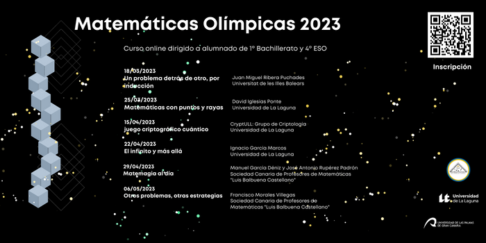 La Sociedad Canaria “Luis Balbuena Castellano» de Profesores de Matemáticas, junto con el Aula Cultural de Matemática divulgativa de la Universidad de La Laguna y el Departamento de Matemáticas de la Universidad de Las Palmas de Gran Canaria lanza una nueva edición del seminario “Matemáticas Olímpicas” dirigido a estudiantes de 4º de E.S.O. y 1º de bachillerato. Este seminario está dirigido al alumnado que tenga un especial gusto por las matemáticas y que deseen continuar el curso que viene con la segunda parte dedicada a la preparación de la Olimpiada Nacional de Matemáticas que se realiza cada año en enero. Las sesiones se llevarán a cabo de forma on-line con el fin de poder seguir llegando a alumnado de todas las islas. Tendrán lugar los sábados de 10:00-12:00 del 18/03/2023 al 06/05/2023.