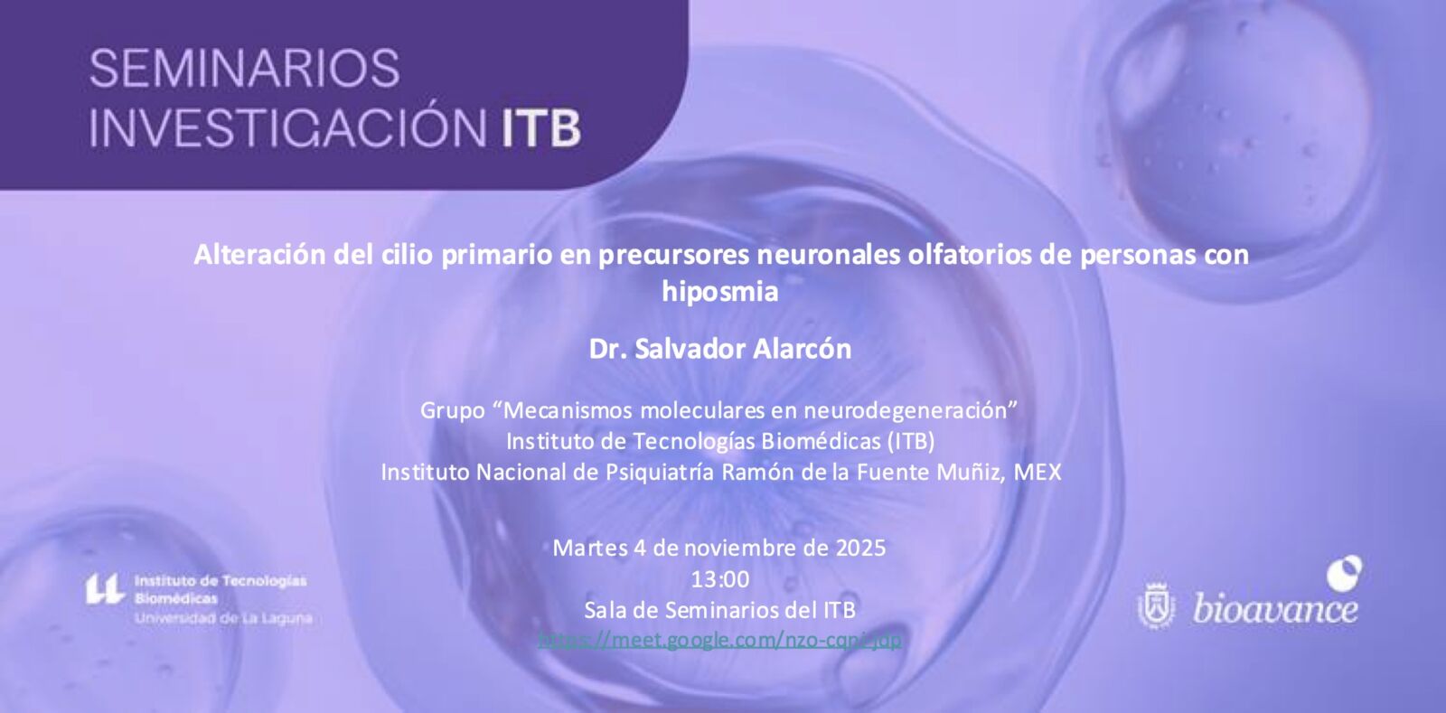El programa de Seminarios de Investigación ITB 2025 continúa el martes día 4 de noviembre a las 13:00 h con un seminario del Dr. Salvador Alarcón (grupo «Mecanismos moleculares en neurodegeneración»), que impartirá la charla «Alteración del cilio primario en precursores neuronales olfatorios de personas con hiposmia».