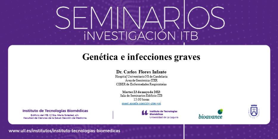 El próximo martes 23 de mayo a las 15:00 h y en el nuevo edificio del Instituto de Tecnologías Biomédicas, dentro del marco de los Seminarios de Investigación del instituto, tendrá lugar el seminario «Genética e infecciones graves», a cargo del Dr. Carlos Flores Infante, investigador del Hospital Universitario Nuestra Señora de Candelaria, Área de Genómica-ITER y CIBER de Enfermedades Respiratorias.
