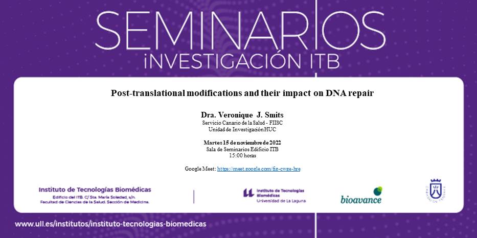El próximo martes 15 de noviembre a las 15:00h y en el nuevo edificio del ITB, dentro del marco de los Seminarios de Investigación del ITB, tendrá lugar el seminario «Post-translational modifications and their impact on DNA repair», a cargo de la Dra. Veronique J. Smits, investigadora de la Unidad de Investigación del Hospital Universitario de Canarias-FIISC.