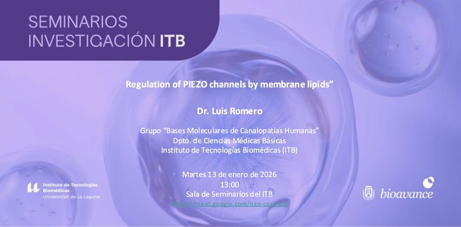 El programa de Seminarios de Investigación ITB 2025 continúa el martes día 13 de enero a las 13:00 horas con un seminario del Dr. Luis Romero, que impartirá la charla «Regulation of PIEZO channels by membrane lipids».