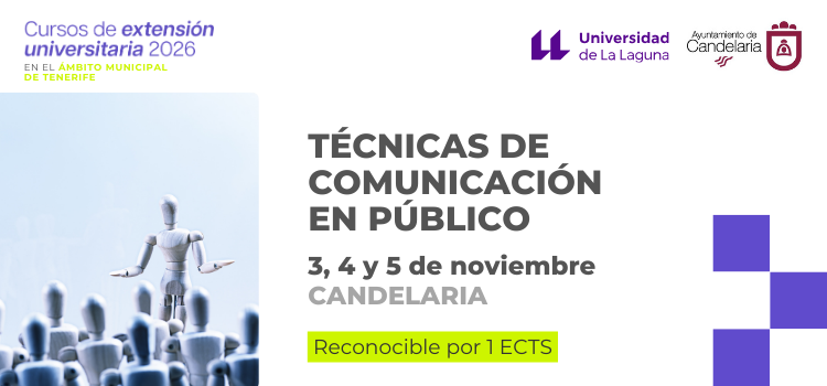 Candelaria acoge el curso «Técnicas de comunicación en público», organizado conjuntamente por el Vicerrectorado de Cultura y Extensión Universitaria y el Ayuntamiento de Candelaria, dentro de la programación de los Cursos de Extensión Universitaria en el ámbito municipal “Ayuntamientos 2026”, que se celebrará los días 3, 4 y 5 de noviembre de 2026.