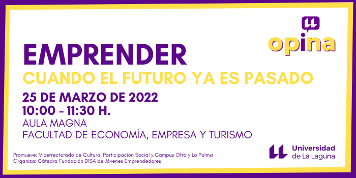 La Universidad de La Laguna promueve, a través del Vicerrectorado de Cultura, Participación Social y Campus Ofra y La Palma, para el próximo viernes 25 de marzo a las 10:00 horas en el Aula Magna de la Facultad de Economía, Empresa y Turismo del Campus de Guajara, una nueva edición de “ULL Opina”. En esta ocasión, lleva por título “Emprender cuando el futuro ya es pasado” y se organiza desde la Cátedra Fundación DISA de Jóvenes Emprendedores de La Universidad de La Laguna y es coordinado por su directora, Carmen Inés Ruiz de la Rosa.