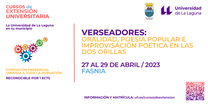 Curso de Extensión Universitaria organizado por el Vicerrectorado de Cultura, Participación Social y Campus Ofra y La Palma en colaboración con el Ayuntamiento de Fasnia, dentro de la programación de la convocatoria de Cursos de Extensión Universitaria en el ámbito municipal “Ayuntamientos 2023”, que se celebrará en el municipio de Fasnia los días 27, 28 y 29 de abril de 2023.