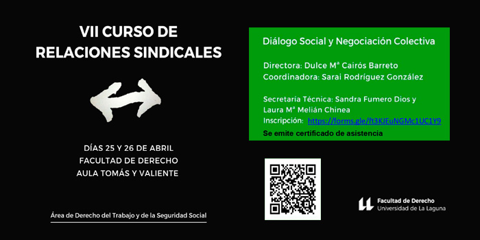 Los días 25 y 26 de abril tendrá lugar el VII Curso de Relaciones Sindicales. Se celebrará el Aula Tomás y Valiente de la Facultad de Derecho a partir de las 16:00 h.