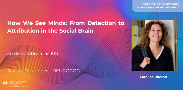 El Instituto Universitario de Neurociencia celebra a una nueva sesión del programa Young Talks que tendrá lugar el jueves 30 de octubre a las 10:00 h en la sala de reuniones del NEUROCOG. En esta ocasión asistirá Carolina Biasiotti, investigadora predoctoral en la Universidad de Trento, que impartirá la charla titulada “How We See Minds: From Detection to Attribution in the Social Brain».