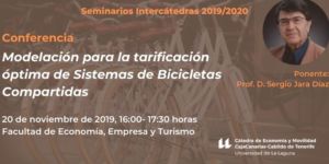 Find out more »Actividad de Extensión Universitaria organizada por la Cátedra de Economía y Movilidad y el Departamento de Economía, Contabilidad y Finanzas dentro del marco de «Seminarios Intercátedras 2019/2020». Colaboran: Fundación CajaCanarias y Cabildo Insular de Tenerife. Objetivos: Ilustrar con fundamentos microeconómicos como diseñar una tarificación óptima en un sistema de bicicletas compartidas. Dirige: Rosa Marina González...
