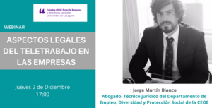 Find out more »Actividad de Extensión Universitaria organizada por la Cátedra CEOE-Tenerife Empresa y Relaciones Laborales de la ULL, que se celebrará en modalidad online el día 2 de diciembre de 2021, en horario de 17:00 – 18:30 horas (insular canaria), dentro del marco de «Seminarios Intercátedras 2021/2022». El webinar tendrá por objetivo dar una visión general sobre el marco legal actual del...