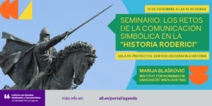 Find out more »El 15 de diciembre a las 10:30 horas tendrá lugar el Seminario de Investigación: 'Seminario de Investigación: Comunicación simbólica Historia Roderici', en la Sala de Proyectos del Edificio de Geografía e Historia. Este encuentro será impartido por Marija Blašković, investigadora del Instituto de Románicas en la Universidad de Viena. Debido al carácter situacional de los encuentros...