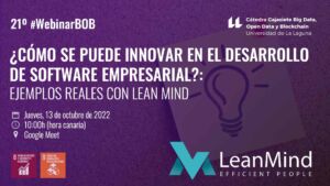 Find out more »La Cátedra de Big Data, Open Data y Blockchain ha organizado el encuentro ¿Cómo se puede innovar en el desarrollo de software empresarial?: Ejemplos reales con Lean Mind para el jueves 13 de octubre a las 10:00 horas que se transmitirá de forma online. El equipo de Lean Mind contará cómo ha logrado un elemento...