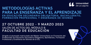 Find out more »Actividad de Extensión Universitaria organizada por la Dirección del Máster Universitario en Formación del Profesorado de Educación Secundaria Obligatoria, Bachillerato, Formación Profesional y Enseñanza de Idiomas de la Universidad de La Laguna, con la colaboración de la Facultad de Educación, que se celebrará en la Facultad de Educación entre el 27 de octubre de 2022...