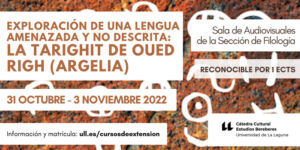 Find out more »Actividad de Extensión Universitaria organizada por la Cátedra Cultural de Estudios Bereberes, que se celebrará en modalidad presencial en la Sala de Audiovisuales de la Sección de Filología entre el 31 de octubre y el 3 de noviembre de 2022. Esta actividad está dividida en tres conferencias impartidas por una especialista en lingüística bereber y en...