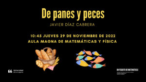 Find out more »El 29 de noviembre de 2022 tendrá lugar en el Aula Magna del Edificio de Matemáticas y Física de la ULL «Un fisquito de Matemáticas». Se trata de una charla divulgativa de 10 minutos. Sobre la mesa habrá un cronómetro que mide el tiempo. Transcurridos los 10 min, si el ponente no ha acabado, el público le agradece...
