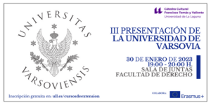 Find out more »Actividad de Extensión Universitaria organizada por la Cátedra Cultural «Francisco Tomás y Valiente» con la colaboración del Programa Erasmus+, que se celebrará en la Facultad de Derecho el 30 de enero de 2023, en horario de 19:00 a 20:00 horas. La Universidad de Varsovia (en polaco: Uniwersytet Warszawski) es la mayor universidad de Polonia y...