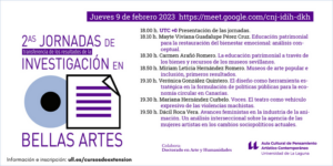 Find out more »Actividad de Extensión Universitaria organizada por el Aula Cultural de Pensamiento Artístico Contemporáneo con la colaboración de Doctorado en Arte y Humanidades que se celebrará en modalidad online el 9 de febrero de 2023, de 18:00 a 21:00 horas. Las 2as Jornadas de transferencia de los resultados de la investigación en Bellas Artes ofrecen un...