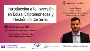 Find out more »El Consejo Social de la Universidad de La Laguna promueve el siguiente webinar online, que impartirá Javier Lorenzo, dirigido a todos los sectores de la comunidad universitaria: “Introducción a la inversión en bolsa, criptomonedas y gestión de carteras” El programa constará de las siguientes sesiones: Sesión 1: Miércoles 8 de febrero de 2023, entre las...