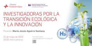 Find out more »El próximo miércoles 31 de mayo a las 16:00 h tendrá lugar el seminario de "Investigadoras por la Transición Ecológica y la Innovación" organizados por la Cátedra Fundación Cepsa, impartido por María Jesús Aguirre Santana de la Universidad de Santiago de Chile. El título del seminario es "Generación in situ de hidrógeno verde a partir de amoniaco". El formato será on-line a través del siguiente...