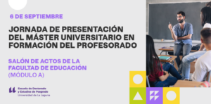 Find out more »La Escuela de Doctorado y Estudios de Posgrado de la Universidad de La Laguna ha organizado una Jornada de presentación del Máster Universitario en Formación del Profesorado de Educación Secundaria Obligatoria y Bachillerato, Formación Profesional y Enseñanza de Idiomas. El acto para todo el alumnado del curso 2023-2024 tendrá lugar el miércoles 6 de septiembre,...