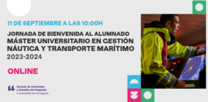 Find out more »El próximo día 11 de septiembre a las 10:00 horas tendrán lugar las Jornadas de Bienvenida al alumnado del Máster Universitario en Gestión Náutica y Transporte Marítimo 2023-2024. Para seguir esta jornada, pulse este enlace. La Jornada de Bienvenida se ha grabado, para poder verla, pulse este enlace.