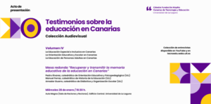 Find out more »La colección Testimonios sobre la educación en Canarias alcanza su cuarto volumen con una nueva entrega dedicada a la memoria educativa del archipiélago, en el marco de una iniciativa impulsada por la Cátedra Fundación MAPFRE Canarias de Tecnología y Educación (TECNOEDU). El evento tendrá lugar el miércoles 28 de enero, a las 16:30 horas, en el Aula Magna (Sala de Rectores y Rectoras) del Edificio Central de la Universidad de La Laguna. Este cuarto volumen de la colección recoge entrevistas…