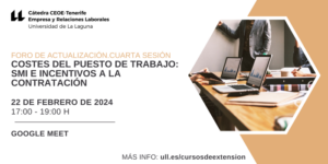 Find out more »La Cátedra CEOE-Tenerife Empresa y Relaciones Laborales de la Universidad de La Laguna organiza, en el marco del «Foro de Actualización de la Cátedra CEOE – Universidad de La Laguna», esta cuarta sesión sobre los costes del puesto de trabajo: SMI e incentivos a la contratación, que se celebrará en modalidad online el 22 de febrero de 2024, en horario de 17:00 a 19:00 horas. Hace apenas unos meses que ha entrado en vigor el Real Decreto-Ley 1/2023, de 10…