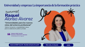 Find out more »La Cátedra CEOE-Tenerife Universidad de La Laguna de Empresa y Relaciones Laborales, organiza un nuevo encuentro bajo el título: “Universidad y empresa: La importancia de la formación práctica”, que tendrá lugar el miércoles 11 de junio a las 9:30 h, en la Sede de CEOE Tenerife. Se contará como ponente principal con Raquel Alonso Álvarez, experta en dirección de proyectos y relaciones institucionales en el ámbito educativo, con una amplia trayectoria liderando iniciativas de alto impacto en instituciones públicas, privadas…