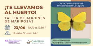Find out more »Taller de Extensión Universitaria organizado por la Cátedra de Medio Ambiente y Desarrollo Sostenible Cabildo de Tenerife – ULL, con la colaboración de Cambium Acompañamiento Sostenible, que tendrá lugar en el Huerto Garoé en la Escuela Superior de Ingeniería y Tecnología, el 23 de junio de 2022. El objetivo del taller es aprender a diseñar y construir jardines de mariposas. Dirigido al público en general. Dirige: Marta María Domínguez Herrera, Profesora Titular del Departamento de Técnicas y Proyectos de Ingeniería y Arquitectura…