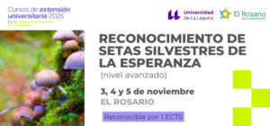 El Rosario acoge el curso «Reconocimiento de setas silvestres de La Esperanza (nivel avanzado)», organizado conjuntamente por el Vicerrectorado de Cultura y Extensión Universitaria y el Ayuntamiento de El Rosario, dentro de la programación de los Cursos de Extensión Universitaria en el ámbito municipal “Ayuntamientos 2026”, que se celebrará los días 3, 4 y 5 de noviembre de 2026. El objetivo principal de este curso es acercar a los participantes al mundo de la micología y darles conocimientos básicos sobre el reino…