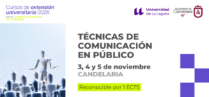 Candelaria acoge el curso «Técnicas de comunicación en público», organizado conjuntamente por el Vicerrectorado de Cultura y Extensión Universitaria y el Ayuntamiento de Candelaria, dentro de la programación de los Cursos de Extensión Universitaria en el ámbito municipal “Ayuntamientos 2026”, que se celebrará los días 3, 4 y 5 de noviembre de 2026. Objetivos: - Dotar al alumnado de habilidades en materia de comunicación de cara al público. - Iniciar al alumnado en las artes de la oratoria, la argumentación y el…