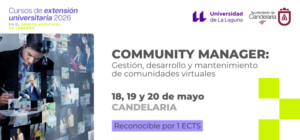 Candelaria acoge el curso «Community Manager: Gestión, desarrollo y mantenimiento de comunidades virtuales», organizado conjuntamente por el Vicerrectorado de Cultura y Extensión Universitaria y el Ayuntamiento de Candelaria, dentro de la programación de los Cursos de Extensión Universitaria en el ámbito municipal “Ayuntamientos 2026”, que se celebrará los días 18, 19 y 20 de mayo de 2026. Esta formación proporciona las bases para introducirse en la gestión y crecimiento de comunidades virtuales como una de las formas primordiales de tener presencia en…