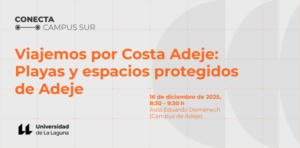 La Facultad de Economía, Empresa y Turismo, en el marco de CONECTA CAMPUS SUR, organiza este evento que se celebrará en el Centro Cultural de Adeje el 16 de diciembre de 2025, en horario de 8:30 a 9:30 horas. Con esta actividad se pretende poner en valor la interacción entre Turismo y Medioambiente. Binomio que combina la gestión turística, la interpretación del patrimonio (tangible e intangible) y las prácticas sostenibles para crear experiencias de viaje responsable. Ponente: Belén de Ponte de…