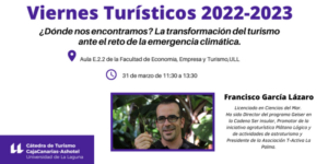 Find out more »La Cátedra de Turismo CajaCanarias – Ashotel de la Universidad de La Laguna organiza este seminario que se celebrará en la Facultad de Economía, Empresa y Turismo el 31 de marzo de 2023 en horario de 11:30 a 13:30 horas. Los objetivos de los Viernes Turísticos es acercar a los alumnos y al público general...