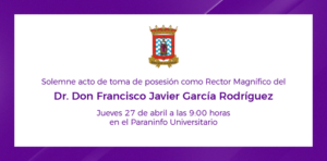 Find out more »El Paraninfo Universitario acoge el jueves 27 de abril a las 9:00 horas el solemne acto de toma de posesión como Rector Magnífico del Doctor Don Francisco Javier García Rodríguez, elegido el pasado 13 de abril en los comicios celebrados en la institución académica. De acuerdo con la nueva Ley Orgánica del Sistema Universitario su...
