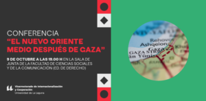 Find out more »La Sala de Juntas de la Facultad de Ciencias Sociales y de la Comunicación acoge el jueves 9 de octubre a las 19:00 horas la conferencia “El nuevo Oriente Medio después de Gaza” que será impartida por Ignacio Álvarez-Ossorio Alvariño, Catedrático de Estudios Árabes e Islámicos. Oriente Medio vive inmerso en uno de los periodos más...