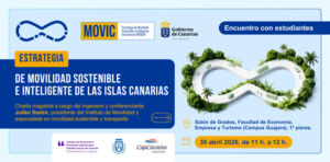 ¿Te has preguntado cómo nos moveremos por las islas en los próximos años? El próximo jueves 30 de abril de 2026, te invitamos a la presentación de la Estrategia de Movilidad Sostenible e Inteligente de las Islas Canarias (MOVIC), un encuentro pensado para que los estudiantes sean partícipes del cambio hacia un modelo de transporte más verde y eficiente. El encuentro se celebrará de 11:00 a 12:00 horas en el Salón de Grados de la Facultad de Economía, Empresa y…