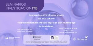 El programa de Seminarios de Investigación ITB 2026 continúa el jueves día 5 de marzo a las 11:00h con un seminario de la Dra. Silvia Gutiérrez, que impartirá la charla "Neurogenic control of tumor growth", y un seminario del Dr. Danilo Boada a las 12:30h, que impartirá la charla "The butterfly lectures and their impact on pain neurobiology". Silvia Gutiérrez es investigadora asociada en Wake Forest University y especialista en la interacción entre la neurobiología del dolor y la progresión…