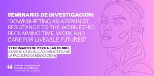 El Seminario de investigación: “Downshifting as a feminist resistance to the work ethic: reclaiming time, work and care for liveable futures” organizado por el Instituto Universitario de Estudio de las Mujeres tendrá lugar el viernes 27 de marzo a las 13:00 horas en el Espacio de Igualdad de la Biblioteca de la Facultad de Educación. Abordará el concepto de downshifting (reducir el ritmo de vida para priorizar el tiempo, los cuidados y el bienestar) como una posible forma de resistencia feminista…